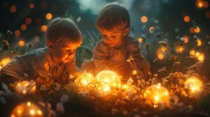 הילדים מאירים על כל מני חפצים בחדר ומחפשים חפצים שמחזירים אור, כמו על החלון, המראה וכו’